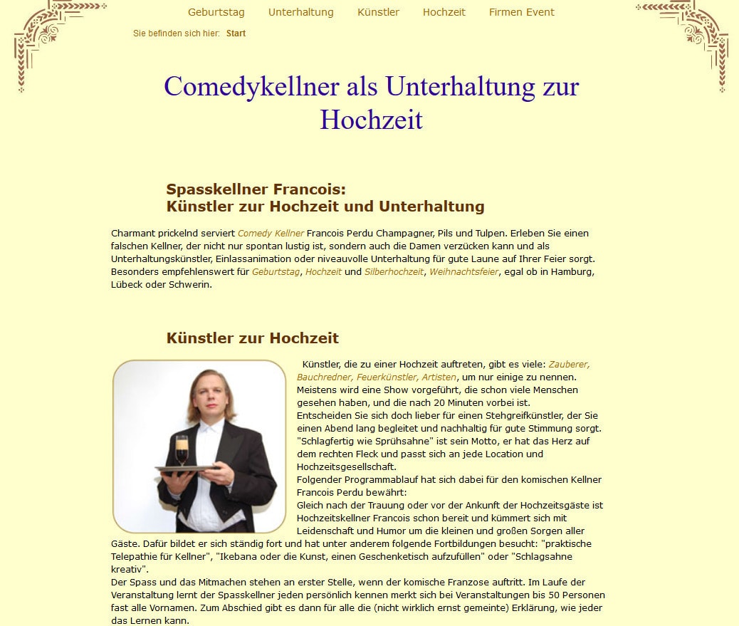 Er ist bundesweit buchbar, und beschreibt sich selbst als „Comedykellner mit guter Seele für niveauvolle Unterhaltung“.